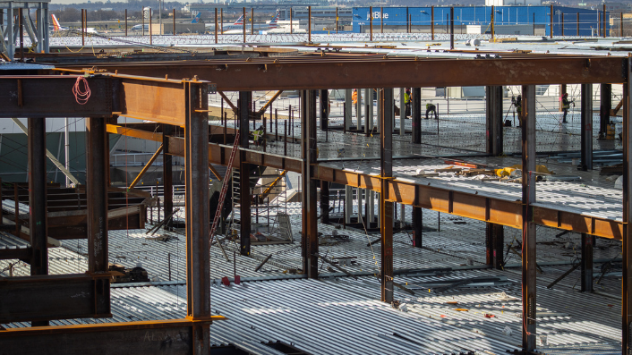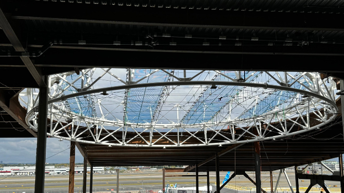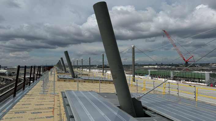 Banker Steel fabricated and NYC Constructors erected 17,000 tons of steel for the new Terminal 6 at JFK International Airport. Set on the north side, this state-of-the-art terminal is built on the sites of the former Terminal 6 and Terminal 7. Its unique design presents sloping columns at the departures curb from the ground to the single-plane roof, reaching for the sky and supported by tightly pretensioned cables. The improved Terminal 6 features 1.2 million square feet of terminal facilities.